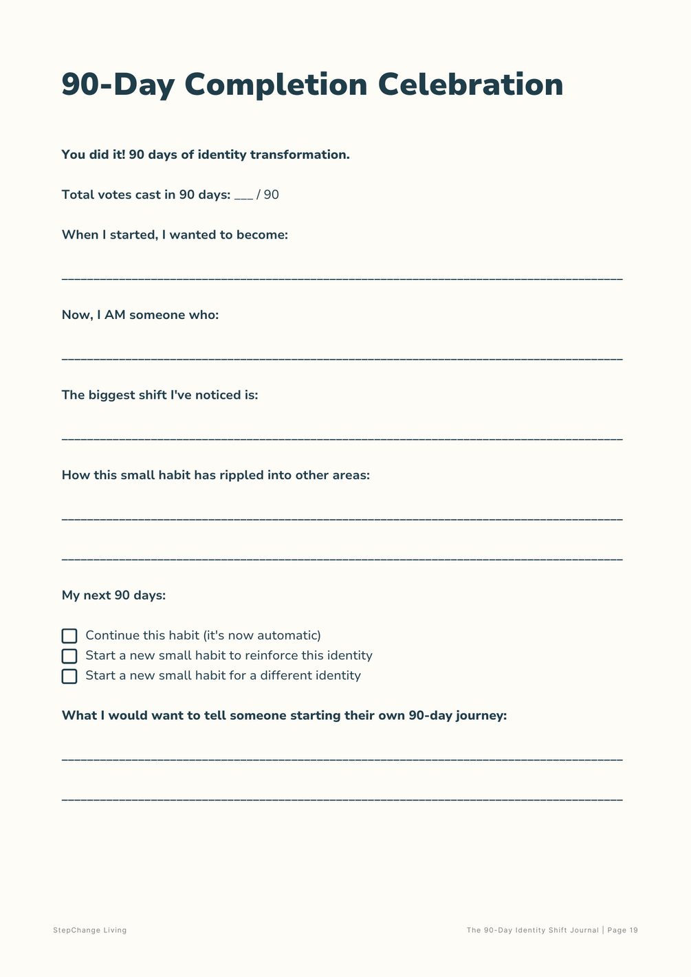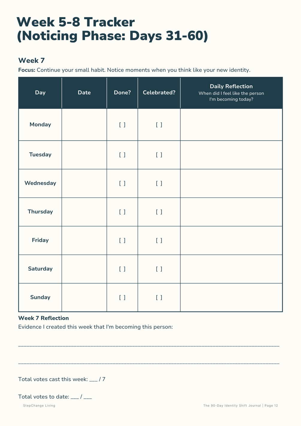 This is not a blank notebook. It is a 23-page guided system that walks you through a 12-week transformation process. It helps you design a "Tiny Habit" – a behaviour so small you can do it on your worst day – and use it to cast daily "votes" for your new identity.