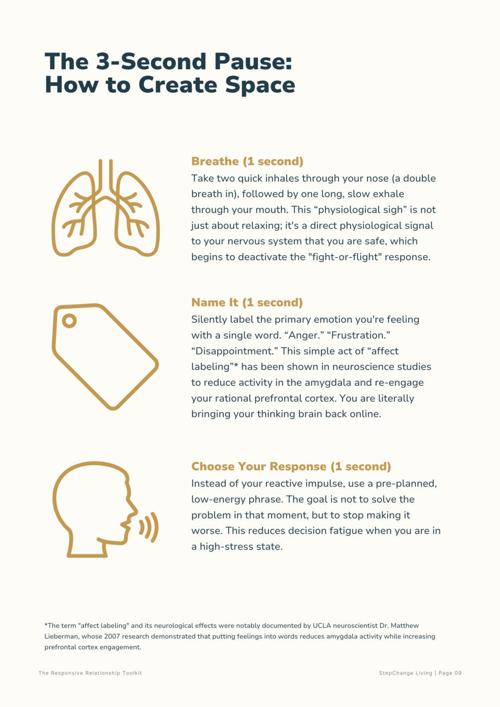 - Part 2: The Core Framework - Learn the "3-Second Pause," a simple, in-the-moment technique to regulate your physiology, engage your rational mind, and choose a more intentional response.