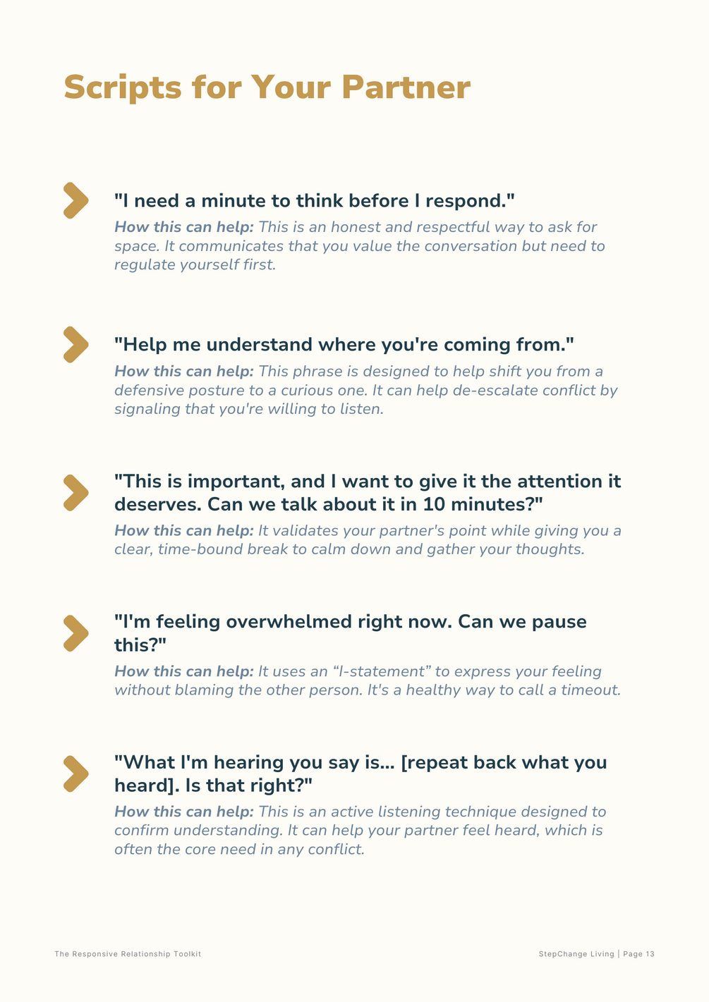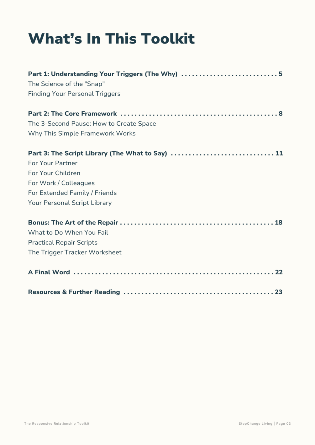 The Responsive Relationship Toolkit is a 25-page, practical PDF toolkit designed to help you understand the science behind your emotional triggers and share simple tools to create a space between a trigger and your reaction. In that space, you can start to find your power to choose.